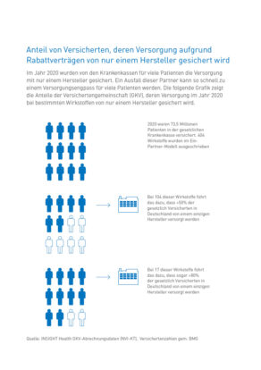 Die Folge ist eine gefährliche Marktverengung, die sich auch bei 104 weiteren Wirkstoffen andeutet: Hier versorgt ein Hersteller bereits mehr als die Hälfte aller gesetzlich Versicherten. Will die Politik eine weitere Marktverengung verhindern, muss sie jetzt eingreifen. Versorgung sollte wieder auf mehrere Schultern verteilt werden. Und zwar indem Aufträge stets an mindestens drei Hersteller vergeben werden (müssen).
