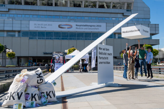 Bei der Installation handelt es sich um eine 9 Meter lange und 4 Meter hohe Wippe, die auf dem Außengelände des ICC aufgebaut wurde. Auf einer Seite der Wippe symbolisieren Geldsäcke die inzwischen auf etwa 30 Milliarden Euro angewachsenen Überschüsse der GKV. Auf der anderen Seite werden dringend benötigte medizintechnische Innovationen für die Patienten immer schwerer erreichbar. “Die Installation bringt auf den Punkt, dass es ein Ungleichgewicht im Gesundheitsmarkt gibt die GKV hortet Überschüsse, während sie Patienten den Zugang zu medizintechnischen Innovationen erschwert”, so BVMed-Geschäftsführer und Vorstandsmitglied Joachim M. Schmitt.