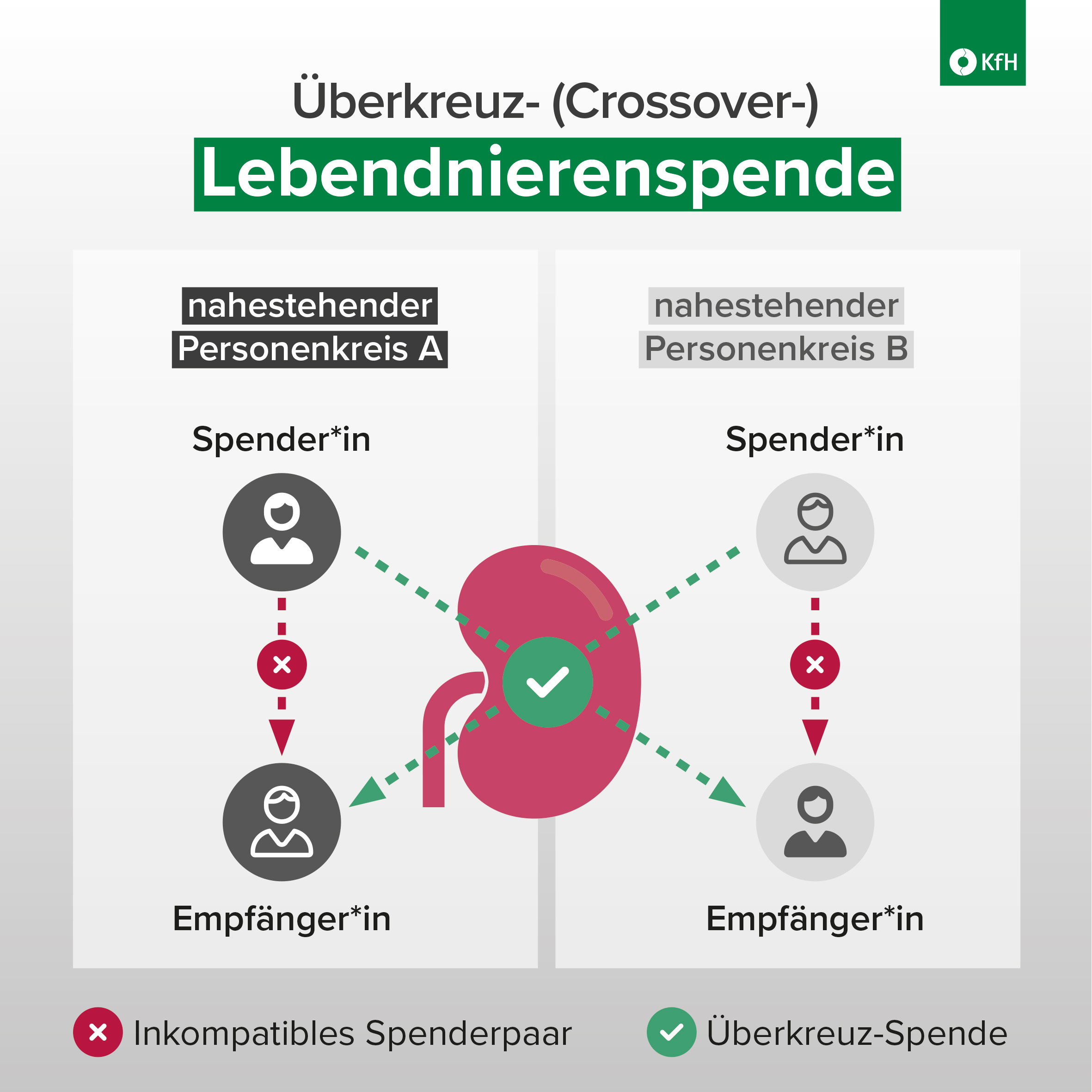 Außerdem konnte nur eine nahestehende Person Spenderin oder Spender sein, etwa Eltern, Geschwister oder Lebenspartnerinnen oder -partner. Allerdings sind manche Paarungen nicht kompatibel, beispielsweise wegen einer Blutgruppen- oder Gewebeunverträglichkeit. Hier wird künftig die Überkreuz-Lebendnierenspende helfen, bei der zwei nicht kompatible Paare organspendekompatibel miteinander kombiniert werden (siehe Grafik). Das KfH Kuratorium für Dialyse und Nierentransplantation e.V., größter und ältester Anbieter von Nierenersatztherapie in Deutschland, begrüßt diese Entscheidung ausdrücklich.