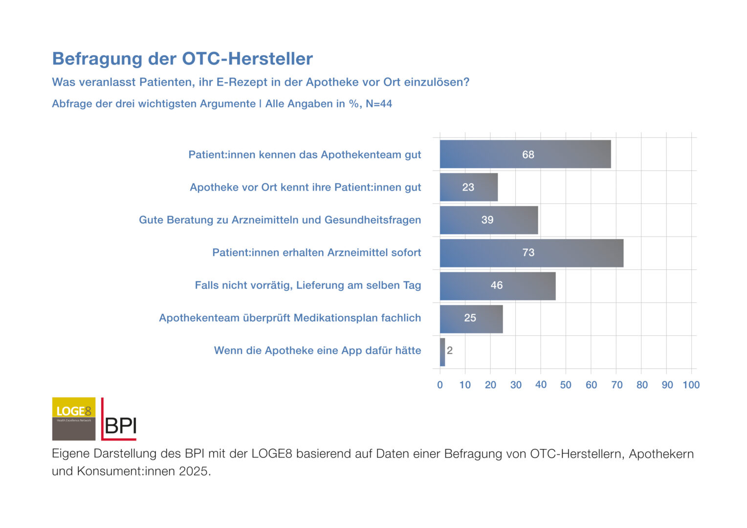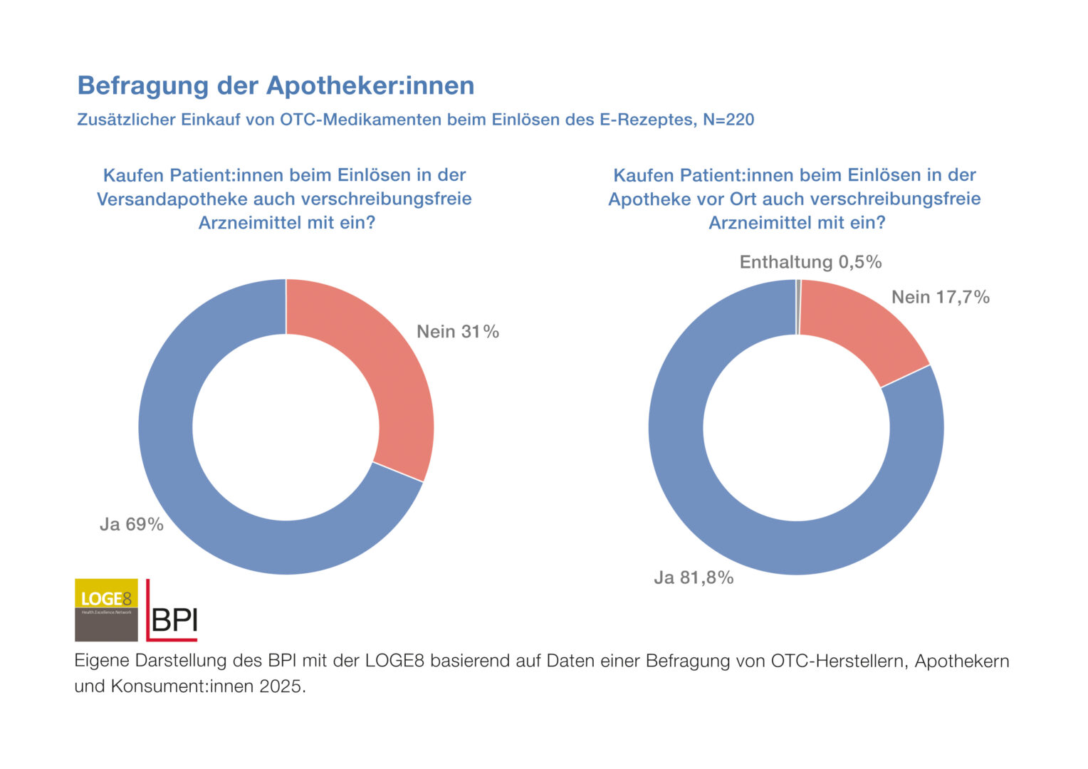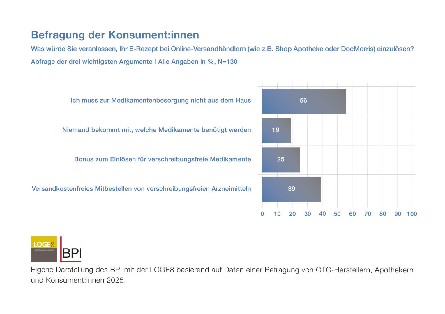 Zum zweiten Mal haben der Bundesverband der Pharmazeutischen Industrie (BPI) und LOGE8 eine umfassende Befragung unter OTC-Herstellern, Apotheken und Konsumentinnen und Konsumenten durchgeführt. Im Mittelpunkt stand die Frage, wie sich das 2024 eingeführte E-Rezept auf das Kaufverhalten von nicht verschreibungspflichtigen Arzneimitteln der Selbstmedikation (OTC) auswirkt. Das neue Stimmungsbarometer zeigt: Für die Mehrheit der Konsumentinnen und Konsumenten stellt das E-Rezept dabei eine Erleichterung dar.