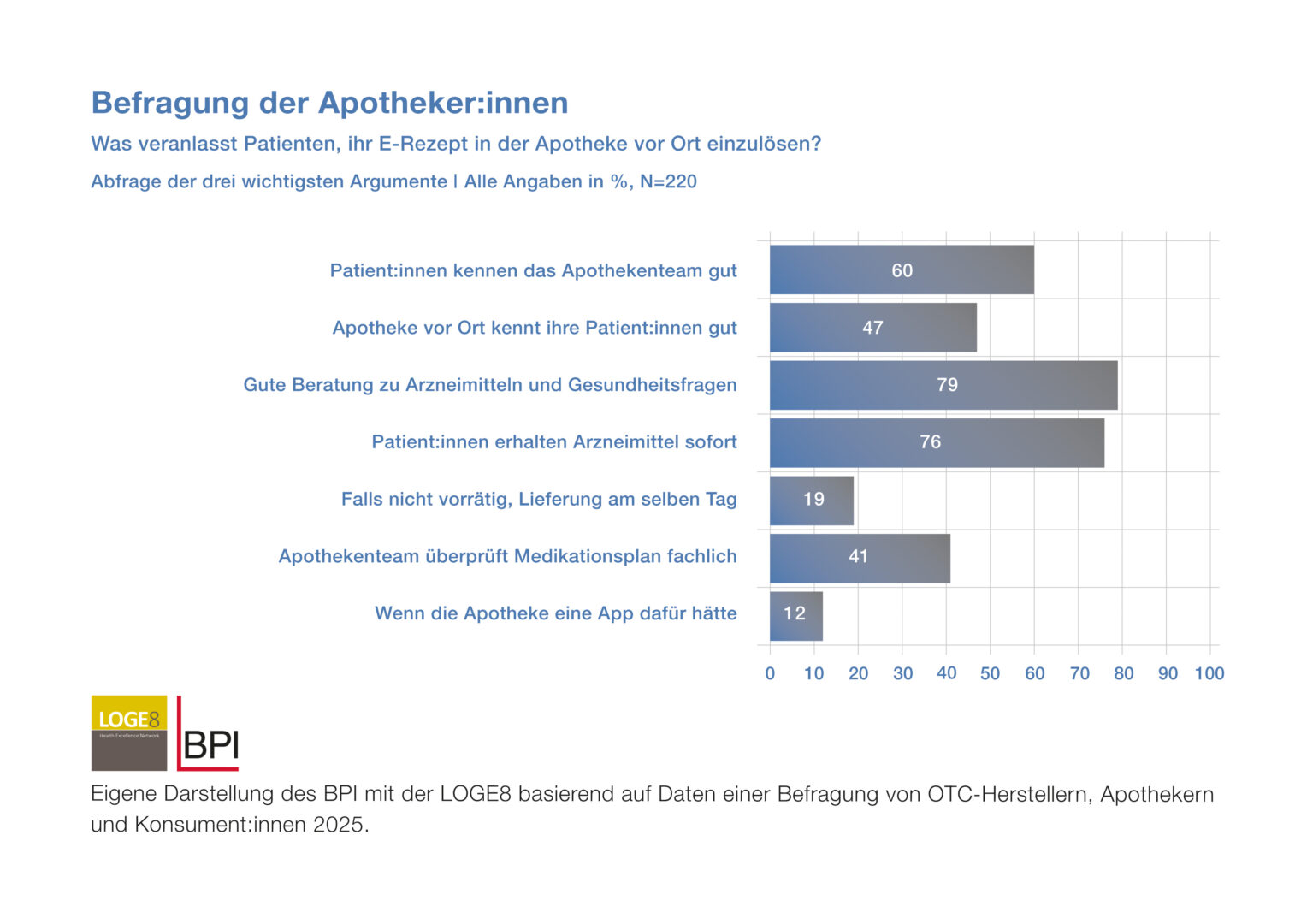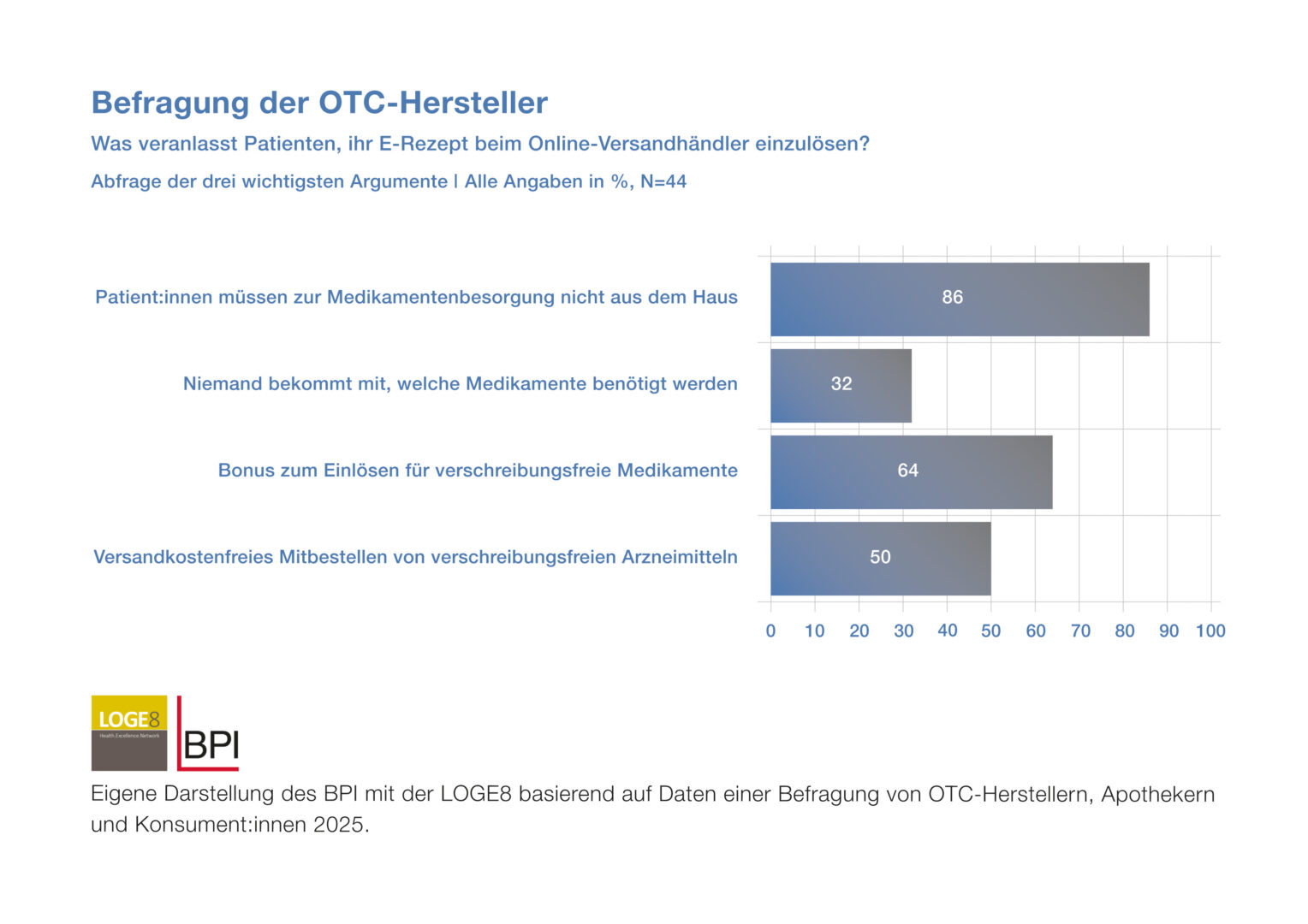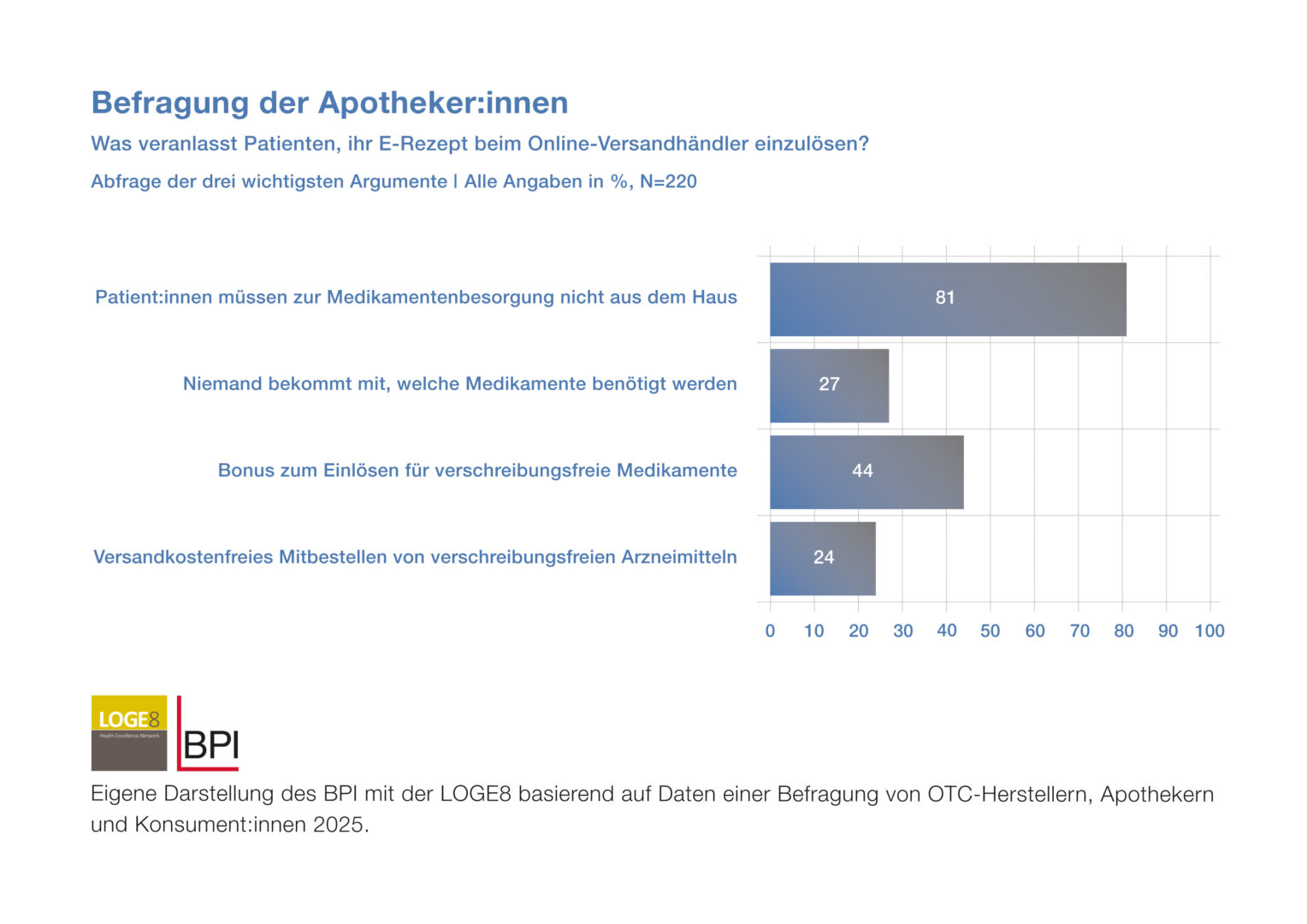 Zum zweiten Mal haben der Bundesverband der Pharmazeutischen Industrie (BPI) und LOGE8 eine umfassende Befragung unter OTC-Herstellern, Apotheken und Konsumentinnen und Konsumenten durchgeführt. Im Mittelpunkt stand die Frage, wie sich das 2024 eingeführte E-Rezept auf das Kaufverhalten von nicht verschreibungspflichtigen Arzneimitteln der Selbstmedikation (OTC) auswirkt. Das neue Stimmungsbarometer zeigt: Für die Mehrheit der Konsumentinnen und Konsumenten stellt das E-Rezept dabei eine Erleichterung dar.